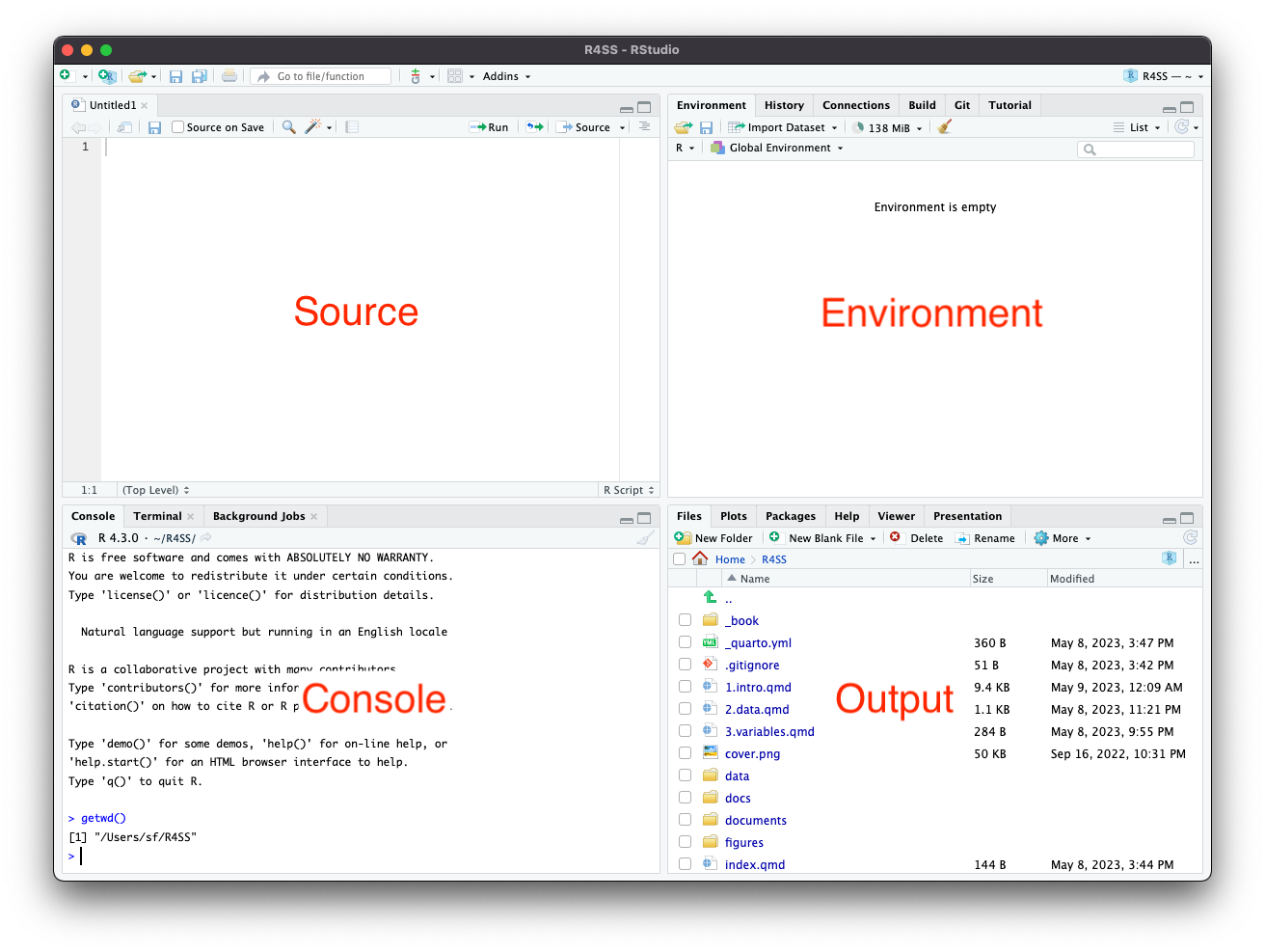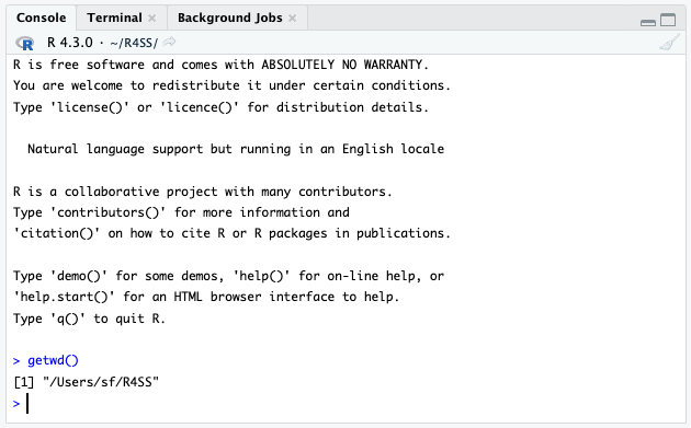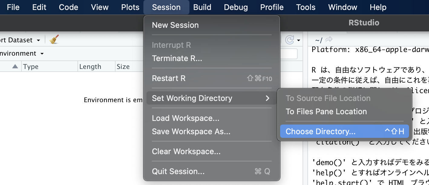 「Session」\(\rightarrow\)「Set Working Directory」\(\rightarrow\)「Choose Directory…」を選択し,R4SSフォルダを探して選択し,「Open」を選択することによって, R4SSが作業ディレクトリとしては認識される.