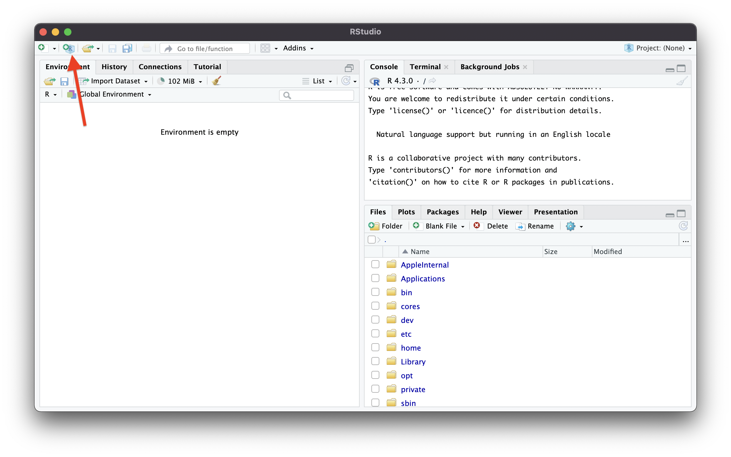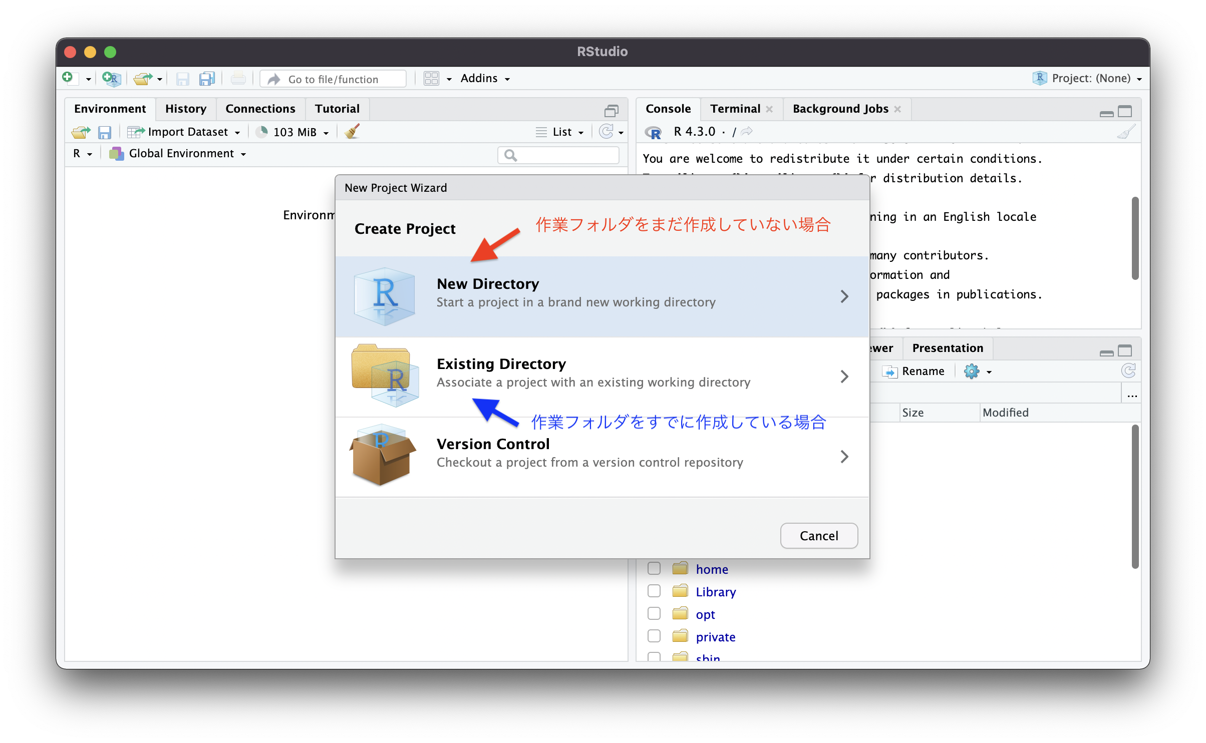 Figure 1.6 のように左上のアイコンからプロジェクトを作成しよう.すでにR4SSという名前のフォルダを作成されているという前提で手順を説明する.