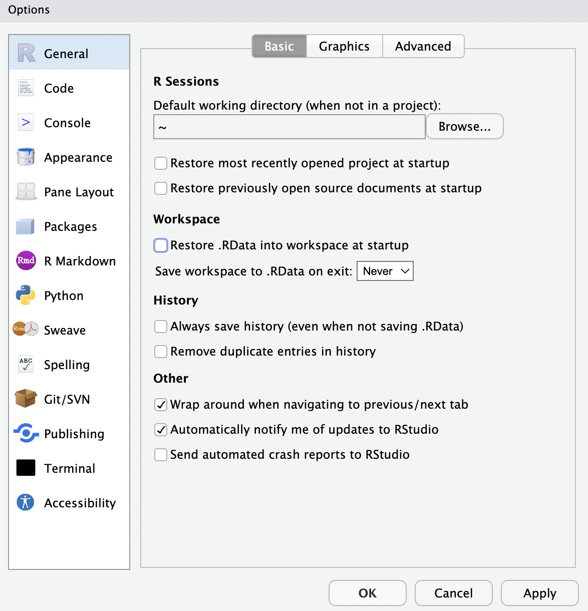 Rスクリプトを保存して終了すればよい.個人的には作業スペースの保存は必要ないと考えるので,Save Workspace…などとたずねられても,Noとする.Figure 1.8 で,「Restore .RData into workspace at startup」のチェックは外し,「Save Workspace to .RDta on exit:」も「Never」としておこう.